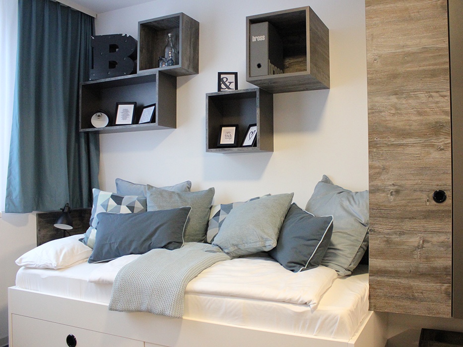 • Komplett möbliert: Bett inklusive Kissen, Bettdecke und Bettwäsche, Kleiderschrank, Schreibtisch, Regal, Spiegel, Esstisch und Stühle