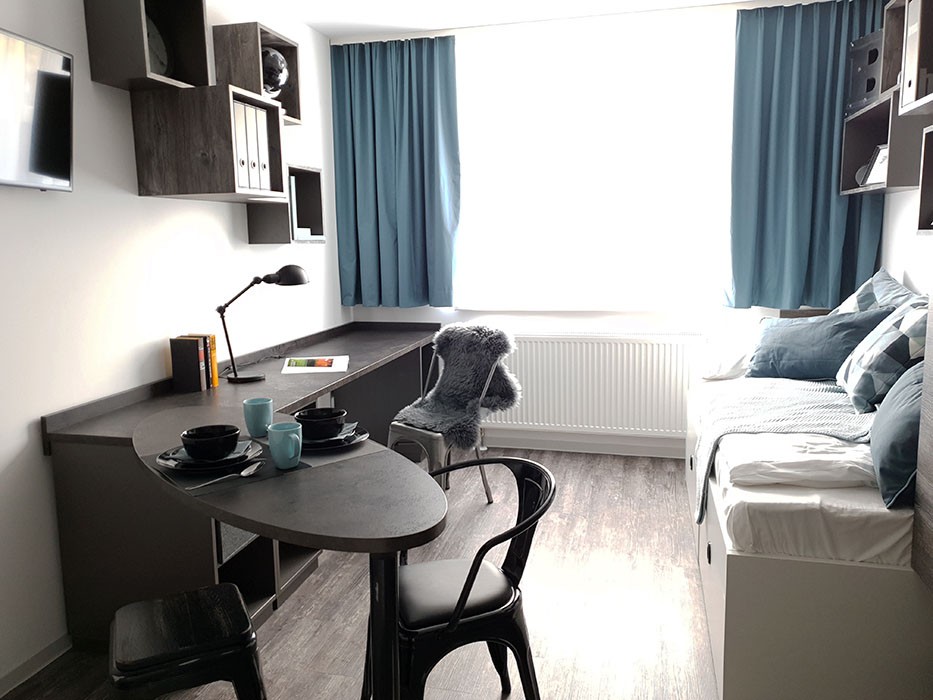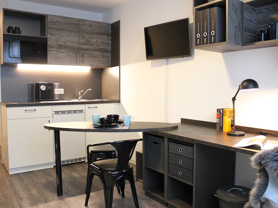 Dein möbliertes Studio Comfort Plus bietet dir genau den Raum, den du brauchst – durchdacht eingerichtet mit eigener Küchenzeile, privatem Bad und allem, was du zum Wohnen und Lernen brauchst.